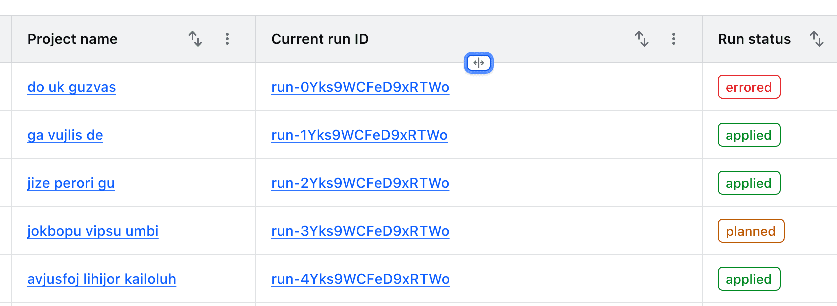 Columns can be resized by dragging the "resize border" with a mouse or by moving focus to it and using the left and right arrow keys.