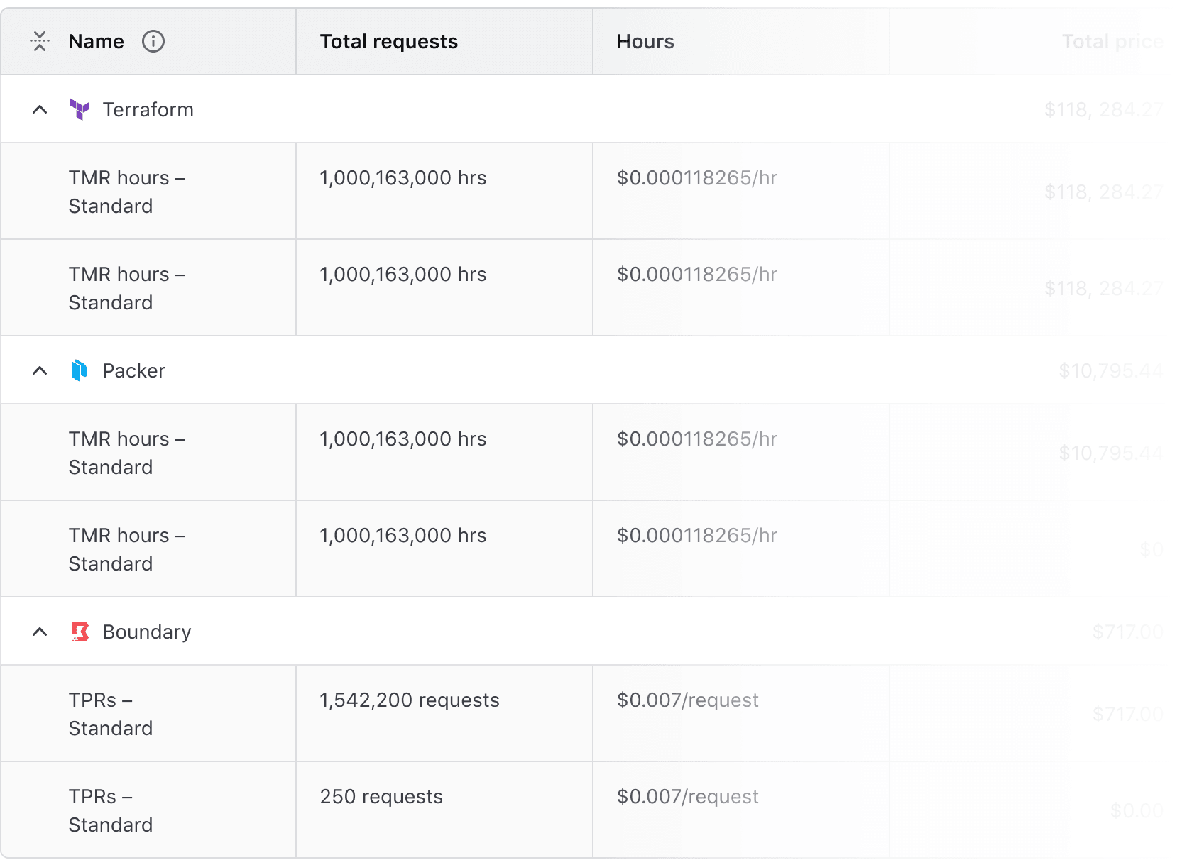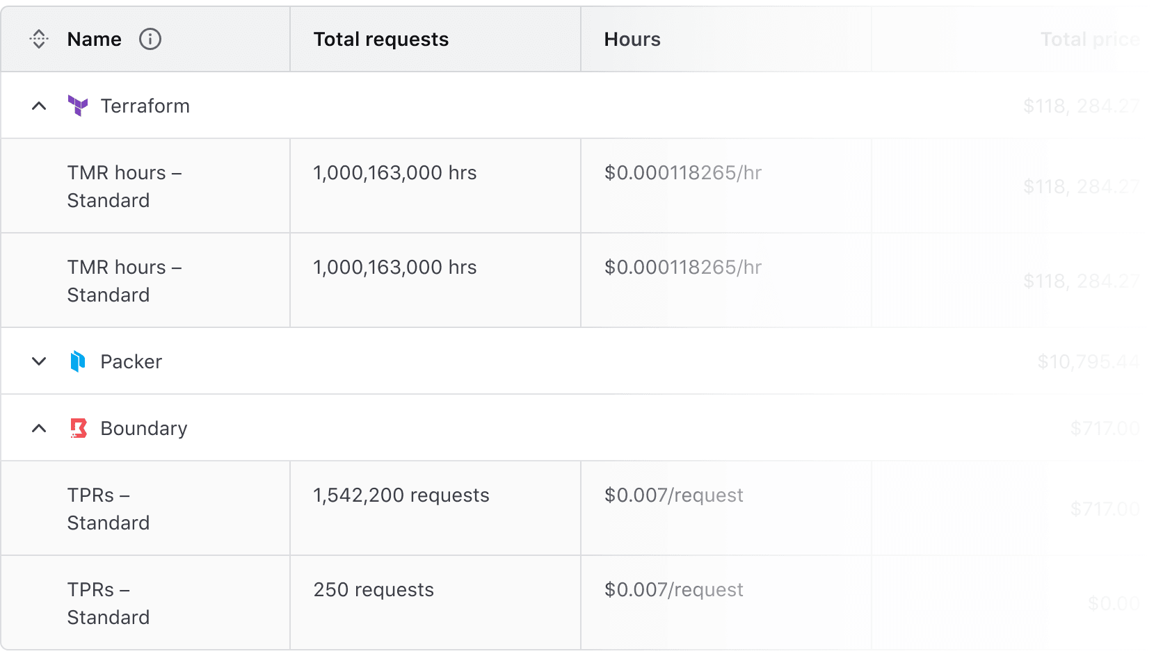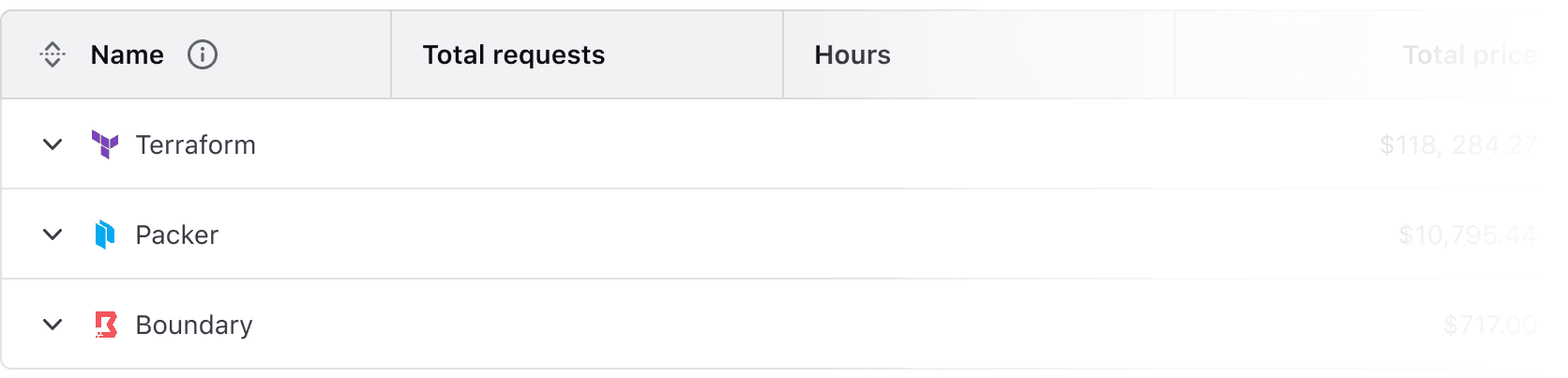 Advanced Table expandable rows. The parent rows display a summary of a Hashicorp product and the total price, the children rows show a breakdown of each billing item from that product and their individual cost.